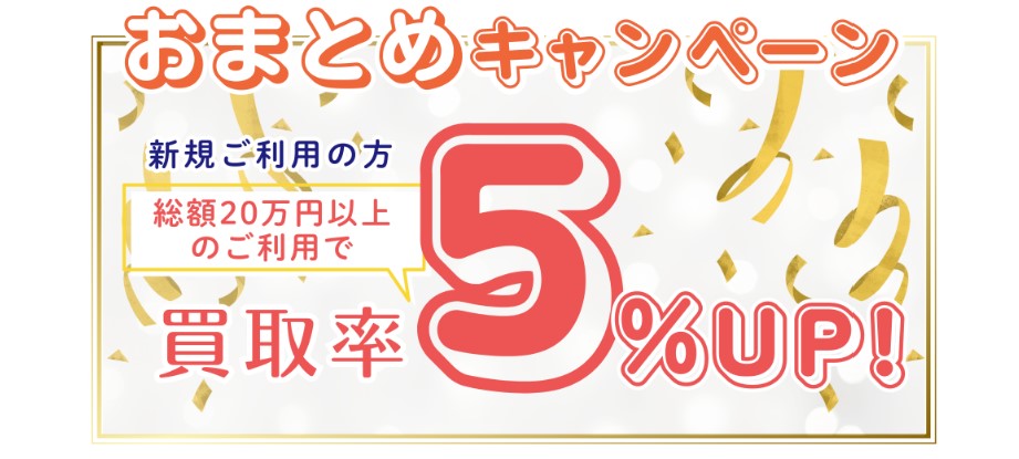 『おまとめキャンペーン』とは20万の商品を購入頂けますと換金率が5%上がる仕組みです。お客様でしたら90%近く換金率がアップするのでお得なキャンペーンになります。新規のご利用の方限定になりますのでご検討はしてみてはどうでしょうか。